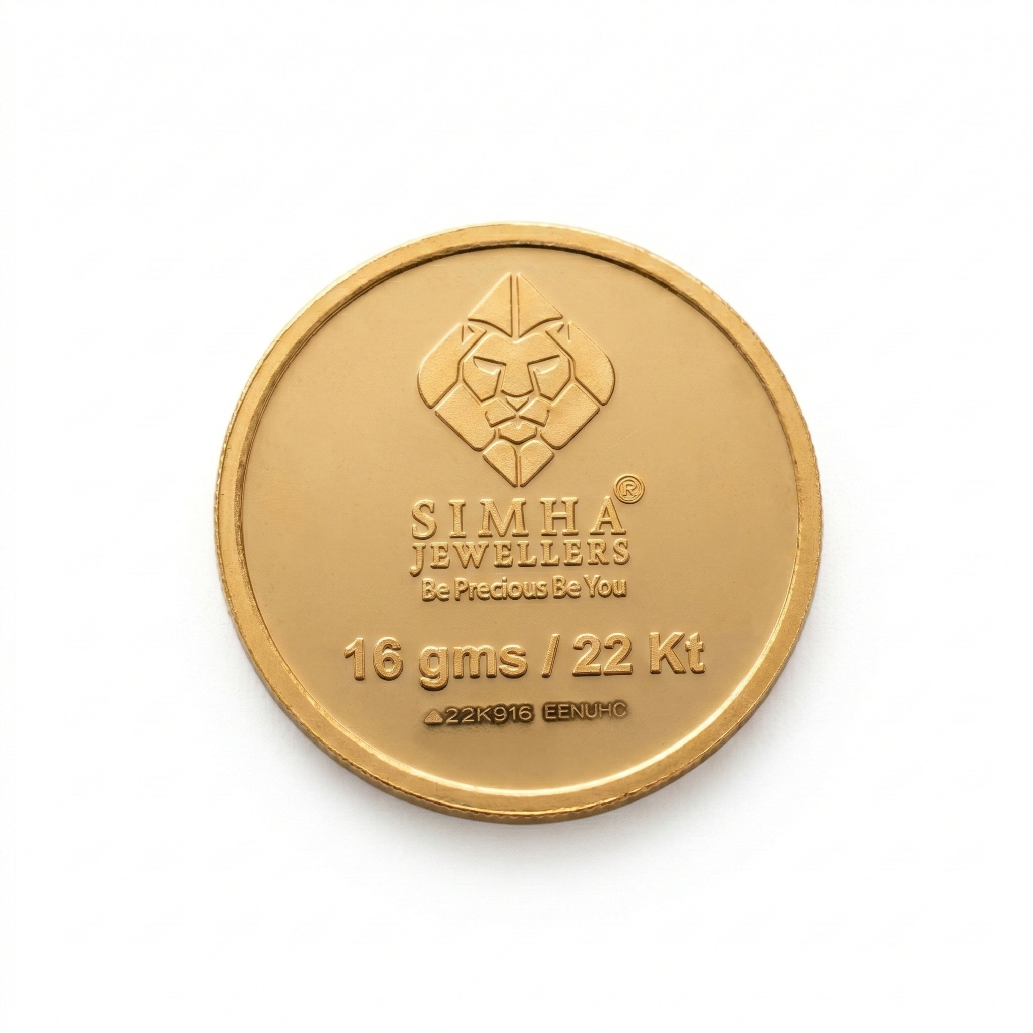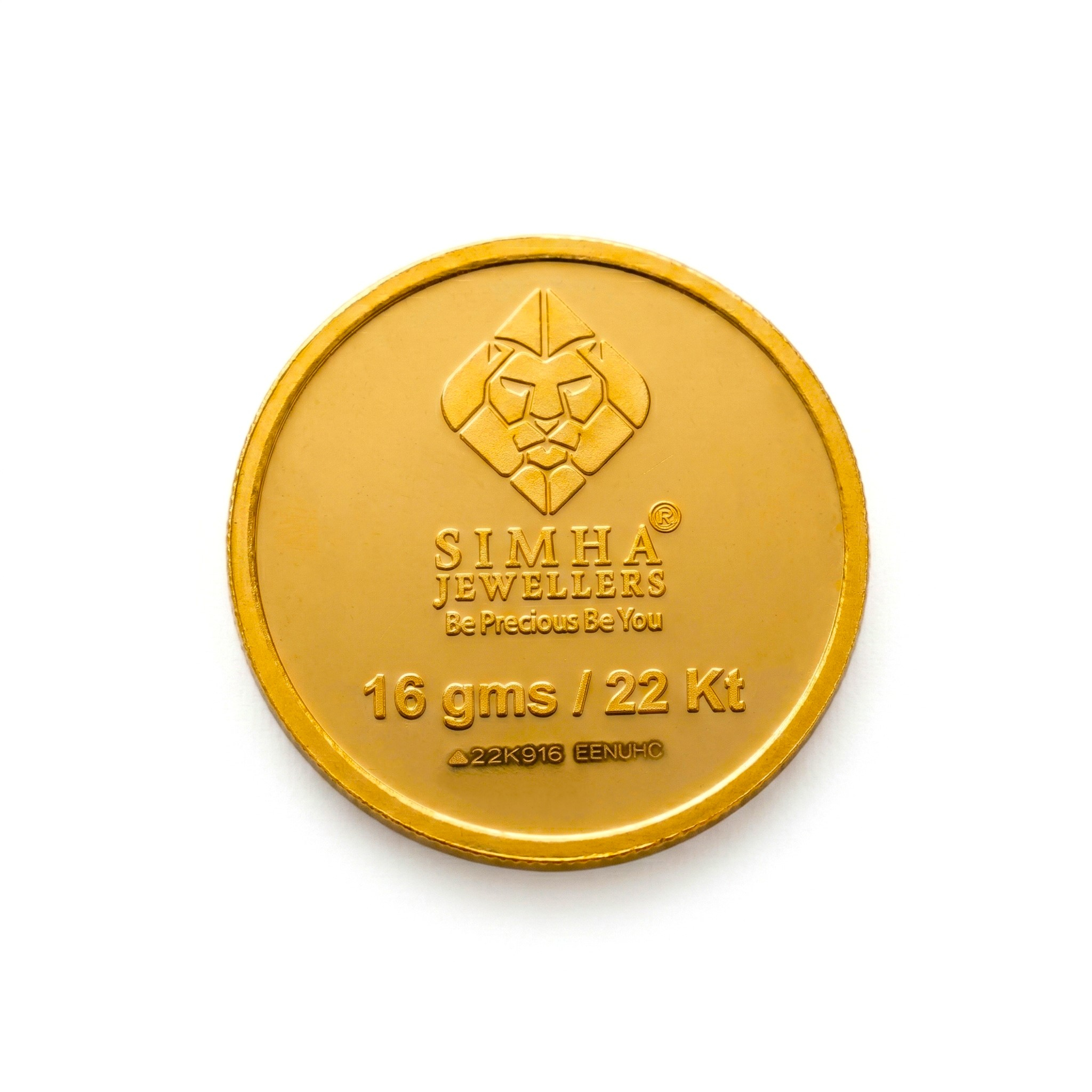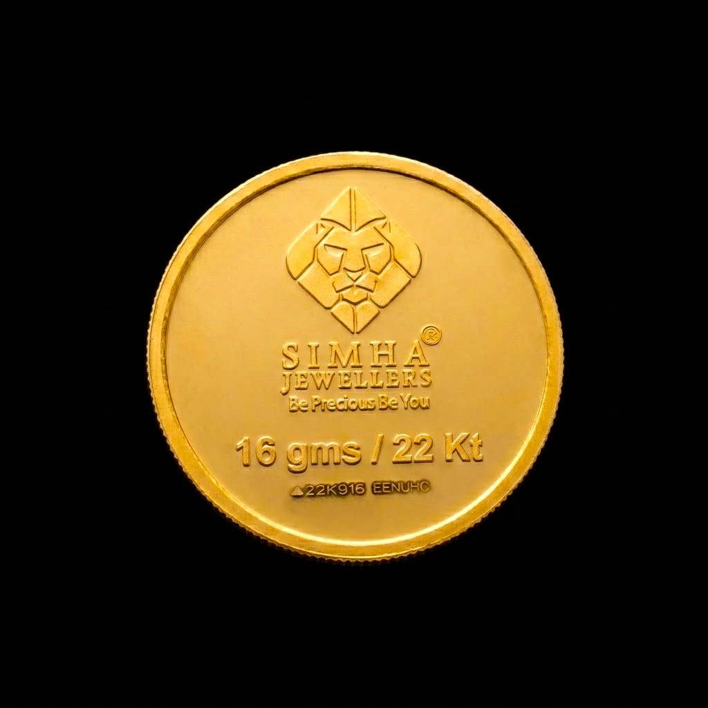 SIMHA 16gm gold coin, crafted in 22K purity. Symbolizing strength and longevity, this beautifully designed coin is perfect for gifting, collecting, or investing. Comes with premium purity and authenticity.