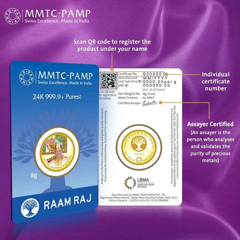 MMTC PAMP 8gm Maharajadhiraj Rajaraam gold coin, crafted in 24K purity. Sealed in tamper -proof packaging for assured purity and authenticity. Ideal for investment, gifting,