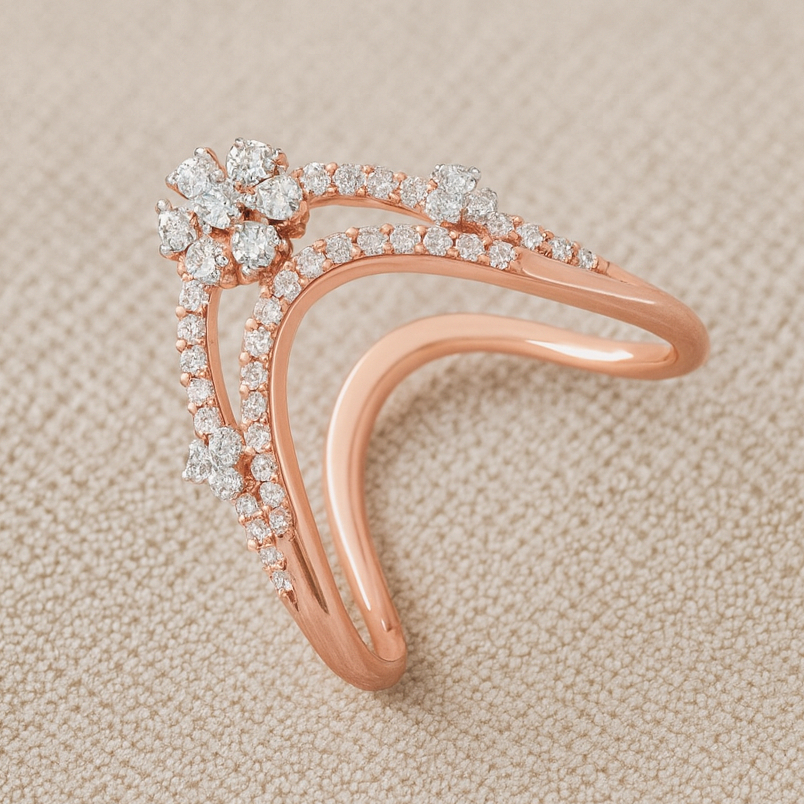 This enchanting ring features dual diamond-studded arcs crowned with blooming floral clusters, creating a graceful harmony of sparkle and design. Crafted in radiant gold, it blends elegance with a touch of nature’s beauty, making it the perfect statement of timeless charm and sophistication.