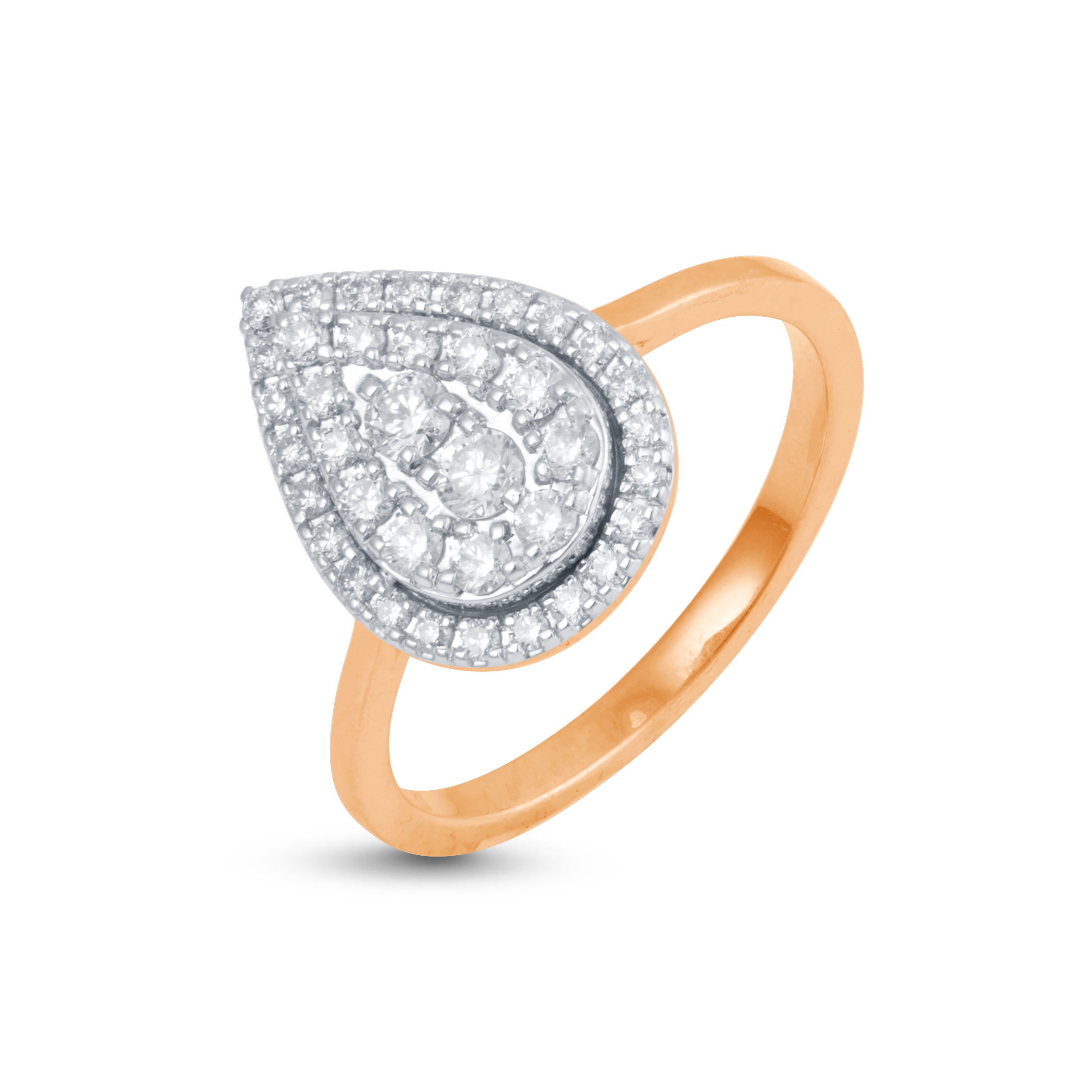 Crafted in gleaming rose gold, this elegant ring features a stunning teardrop-shaped design encrusted with shimmering diamonds. The layered halo effect enhances its brilliance, giving it a timeless and graceful charm. Perfect as a statement of elegance.