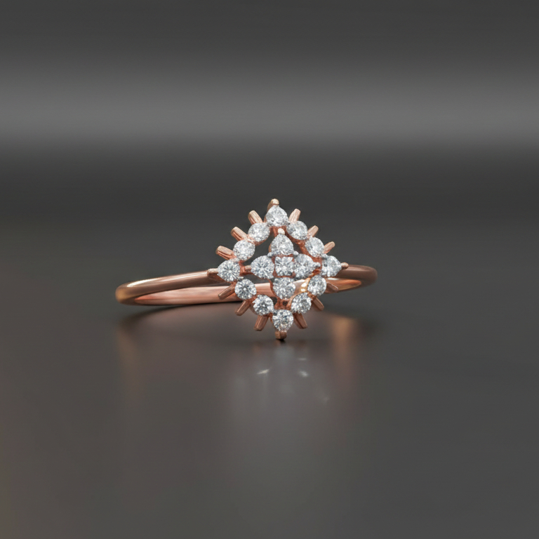 This exquisite rose gold ring features a captivating square cluster of sparkling diamonds, reminiscent of a celestial bloom or a radiant star. Its intricate design adds a touch of sophisticated brilliance to any hand.