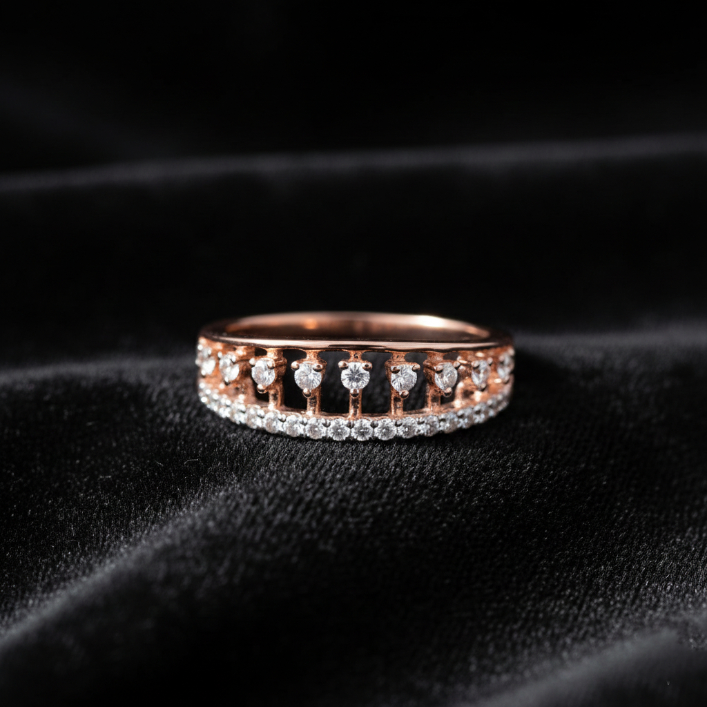 This ring showcases two parallel diamond rows—one a sleek channel of brilliance, the other a crown-like arrangement of elevated diamonds. The structure creates a regal yet modern look, radiating sophistication and charm. Perfect for those who love jewellery that balances elegance.