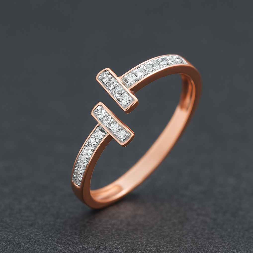 A sleek and modern gold ring designed with clean geometric lines, featuring two parallel diamond-studded bars connected by a slim band. Its minimal yet striking design represents balance, strength, and elegance—perfect for everyday wear or as a chic statement piece
