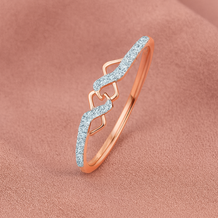 A chic rose-gold ring adorned with sparkling diamonds, designed in a flowing geometric wave pattern. Its artistic curves and modern elegance create a rhythmic charm, making it a perfect piece for those who love style with a touch of uniqueness.