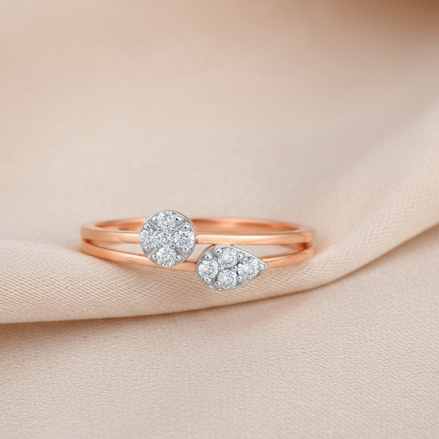 A stylish rose-gold ring featuring a sleek double-band design adorned with two distinct diamond settings—a brilliant round cut and an elegant teardrop cut. Symbolizing harmony and balance, this modern yet timeless piece adds a touch of sparkle to every look.