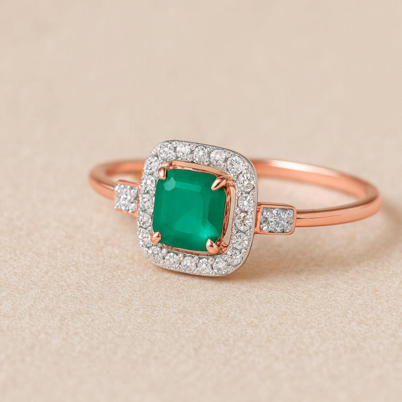 A graceful rose gold ring showcasing a deep green stone at its center, framed by a halo of dazzling diamonds. The slim band with diamond accents adds a touch of modern elegance, making this ring a symbol of sophistication, balance, and timeless charm.