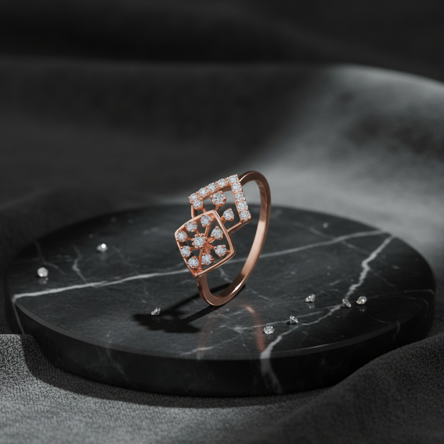 A modern and stylish diamond ring featuring two interlinked square motifs. One square is accented with shimmering diamonds arranged in a floral-inspired cluster, while the other square is bordered with dazzling diamonds for added brilliance. Perfect for everyday elegance or special occasions.