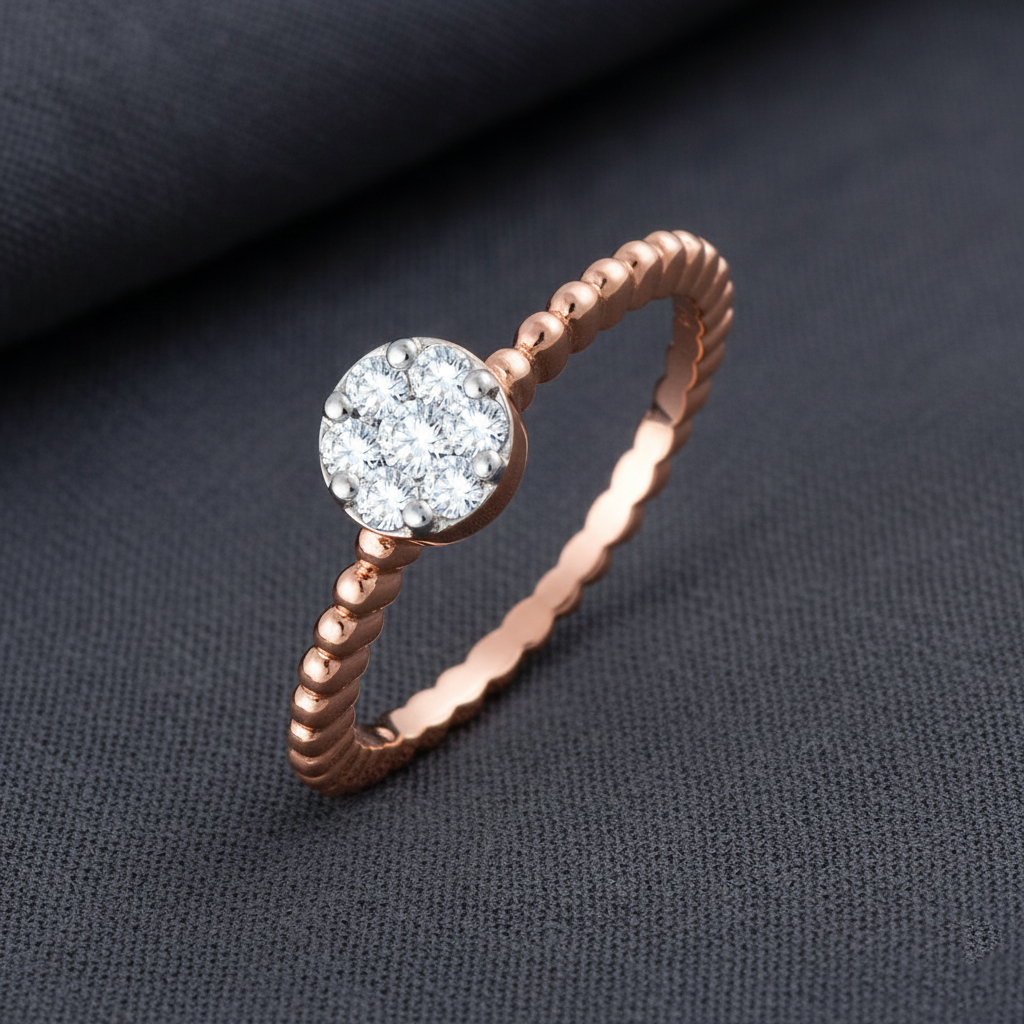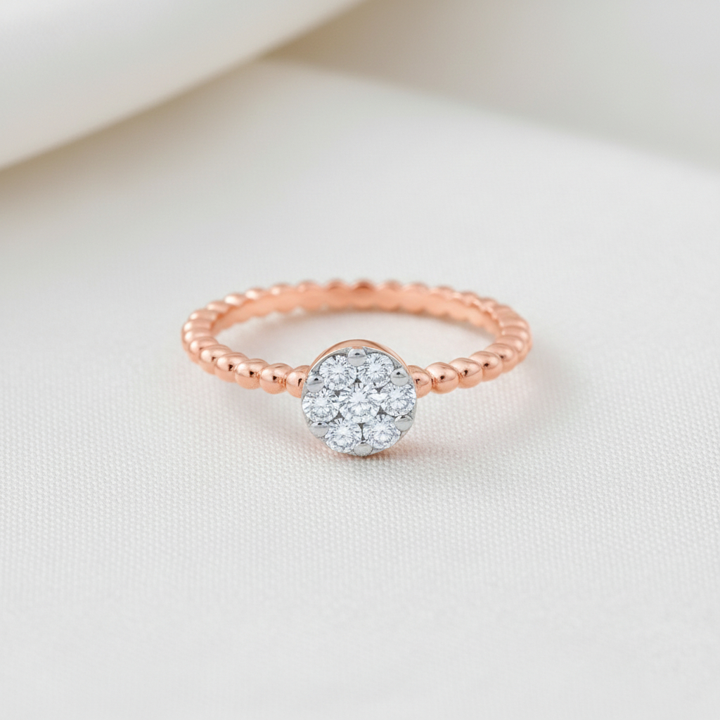 A chic rose gold ring featuring a textured beaded band and a round, diamond-studded center piece. Its minimalist yet sparkling design makes it a versatile piece, perfect for stacking or wearing solo for a touch of everyday elegance.