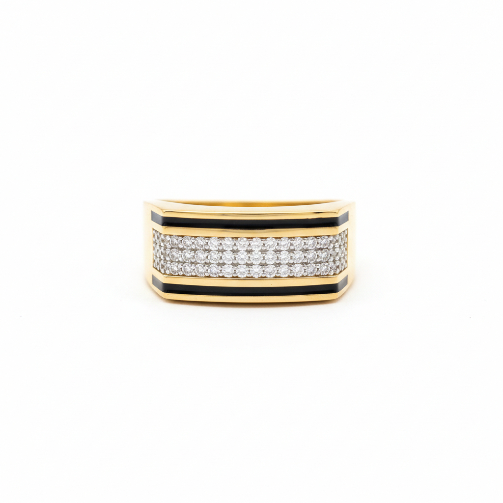 This modern wide-profile ring features three rows of brilliant-cut stones set between sleek black enamel borders. The contrast between the dark polished edges and the central shimmer creates a bold, architectural look perfect for a sophisticated wedding band or statement piece.