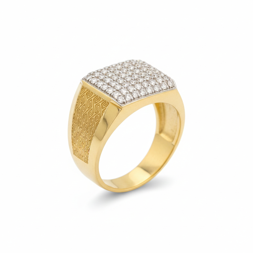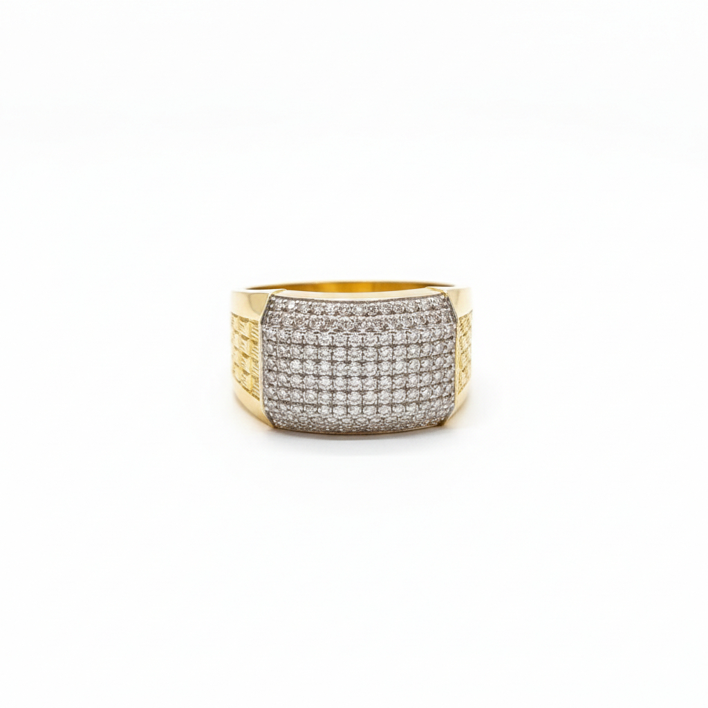 This bold statement ring features a wide golden band topped with a striking rectangular face, densely set with shimmering pavé stones. Its heavy, high-polish finish and brilliant sparkle create a look of undeniable prestige and modern luxury.