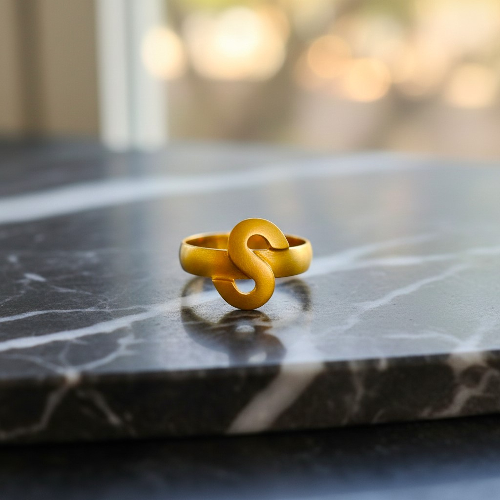 A sleek, golden ring featuring a bold, stylized letter “S” as its centerpiece. The minimalist design wraps smoothly around the finger, offering a modern take on the classic signet style. Perfect for those seeking a personalized, everyday statement piece.