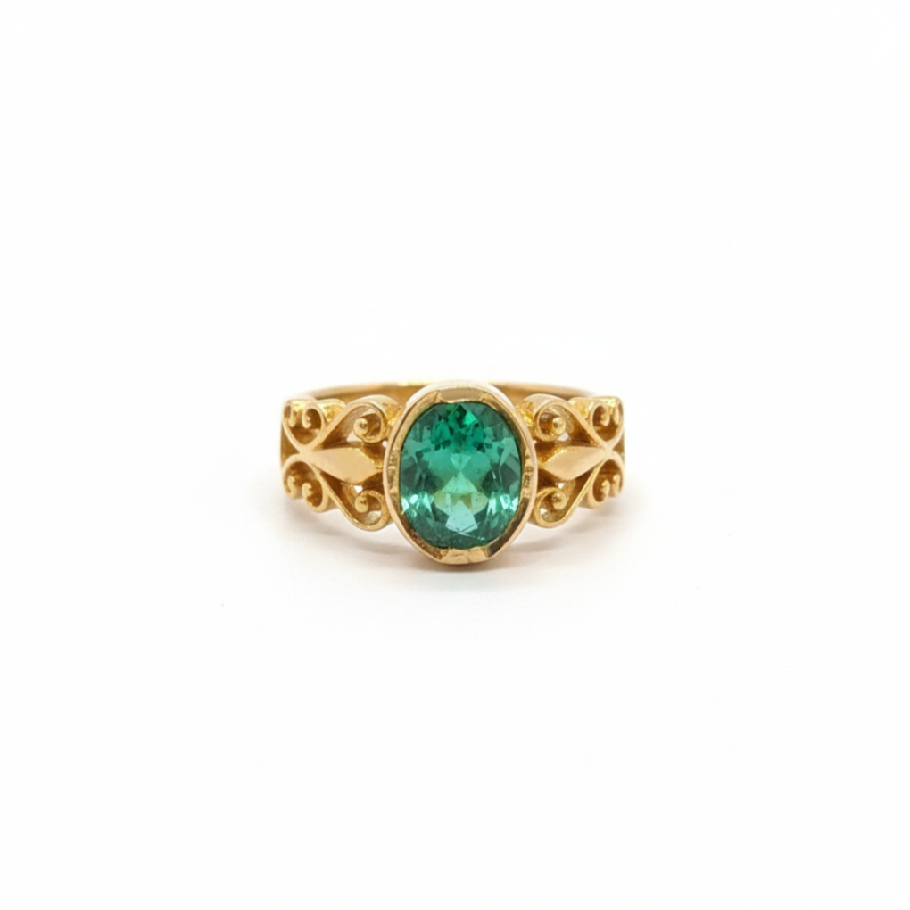 This exquisite gold ring features a deep forest-green, oval gemstone bezel-set into a band of intricate filigree. The ornate scrollwork on the shoulders adds a vintage, regal elegance, making it a timeless statement piece for any collection.