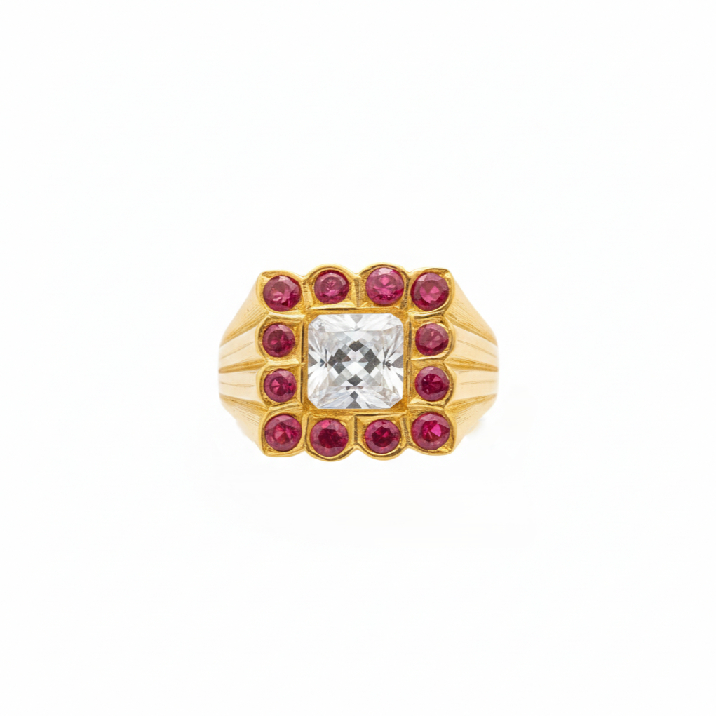 This striking men’s ring showcases a brilliant square stone surrounded by rich pink stones in a sturdy gold setting. A symbol of confidence and royalty, ideal for special occasions or elevated everyday style.