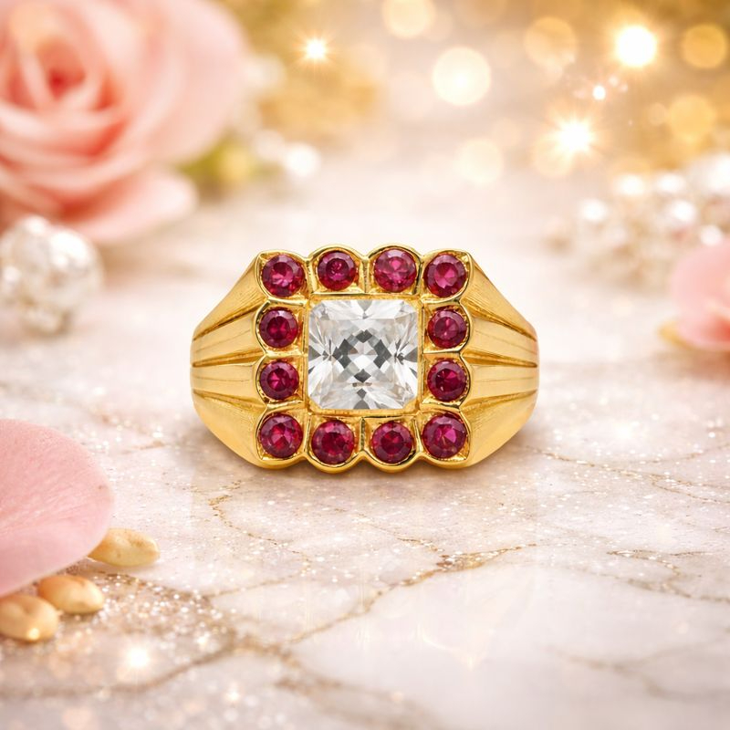 This striking men’s ring showcases a brilliant square stone surrounded by rich pink stones in a sturdy gold setting. A symbol of confidence and royalty, ideal for special occasions or elevated everyday style.