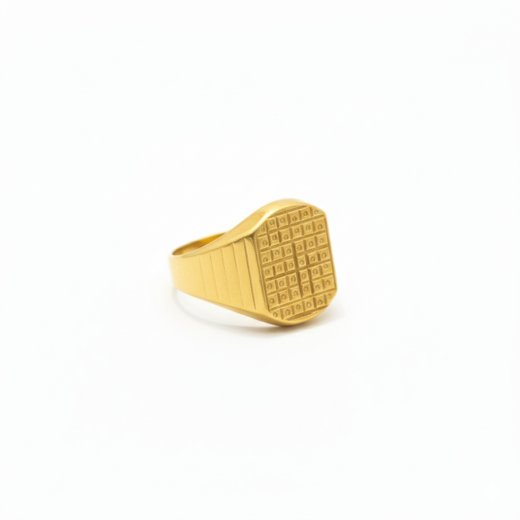 A bold gold ring featuring a textured grid-pattern design that reflects strength and sophistication. Crafted with clean lines and a solid finish, this ring is perfect for those who love timeless style with a powerful, masculine touch—ideal for daily wear or statement occasions