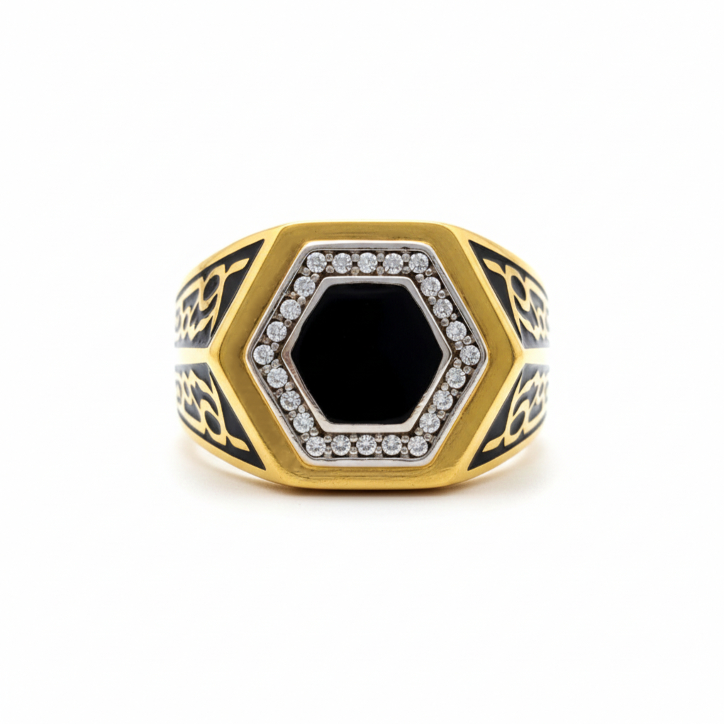 A bold statement ring featuring a striking black hexagon center framed with shimmering stones and rich gold detailing. Designed for strength and elegance, this ring blends modern geometry with timeless luxury—perfect for confident, everyday style and special occasions