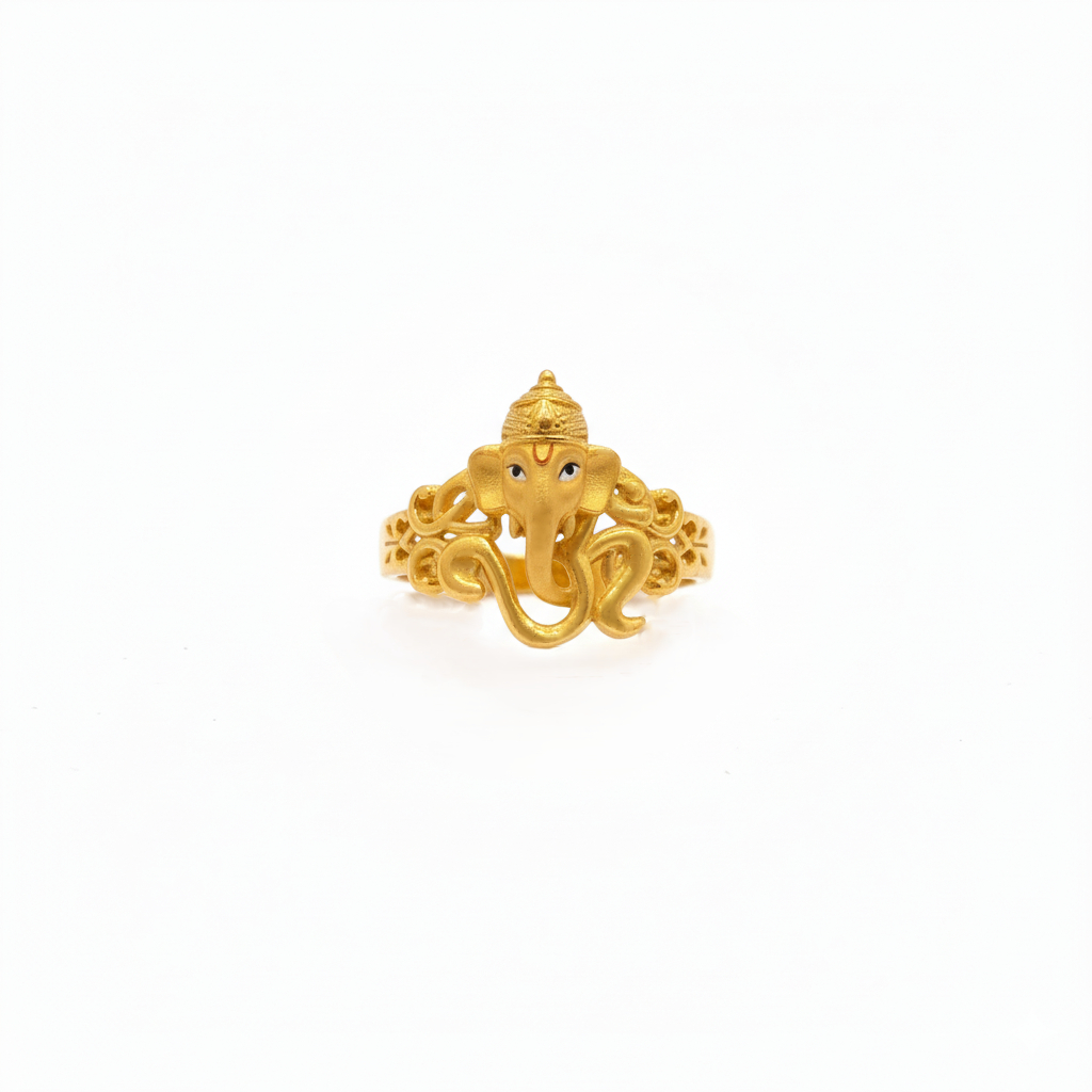 A finely crafted gold ring featuring Lord Ganesha, symbolising wisdom, prosperity, and protection. Designed with intricate detailing, this sacred ring blends devotion with elegance—perfect for daily wear or as a meaningful spiritual gift.