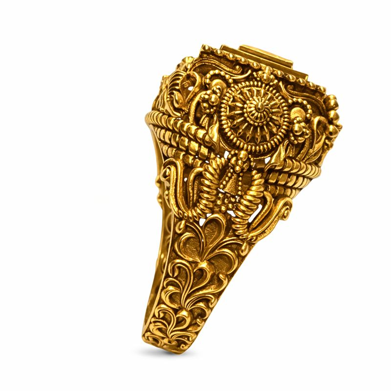 An opulent gold ring crafted with intricate antique carvings, highlighted by a striking square crimson stone at the center and framed with delicate stone detailing. A bold statement piece that reflects royalty, heritage, and timeless luxury.