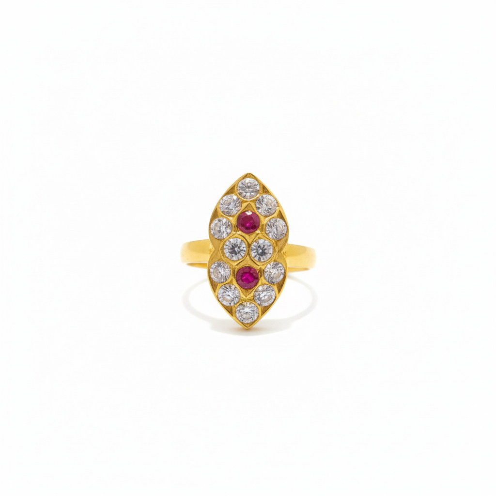 This refined gold ring features a marquise-shaped cluster of sparkling stones accented by vivid ruby highlights. The symmetrical layout creates graceful balance while the rich red tones add depth and drama—perfect for those who appreciate classic glamour with a contemporary edge.