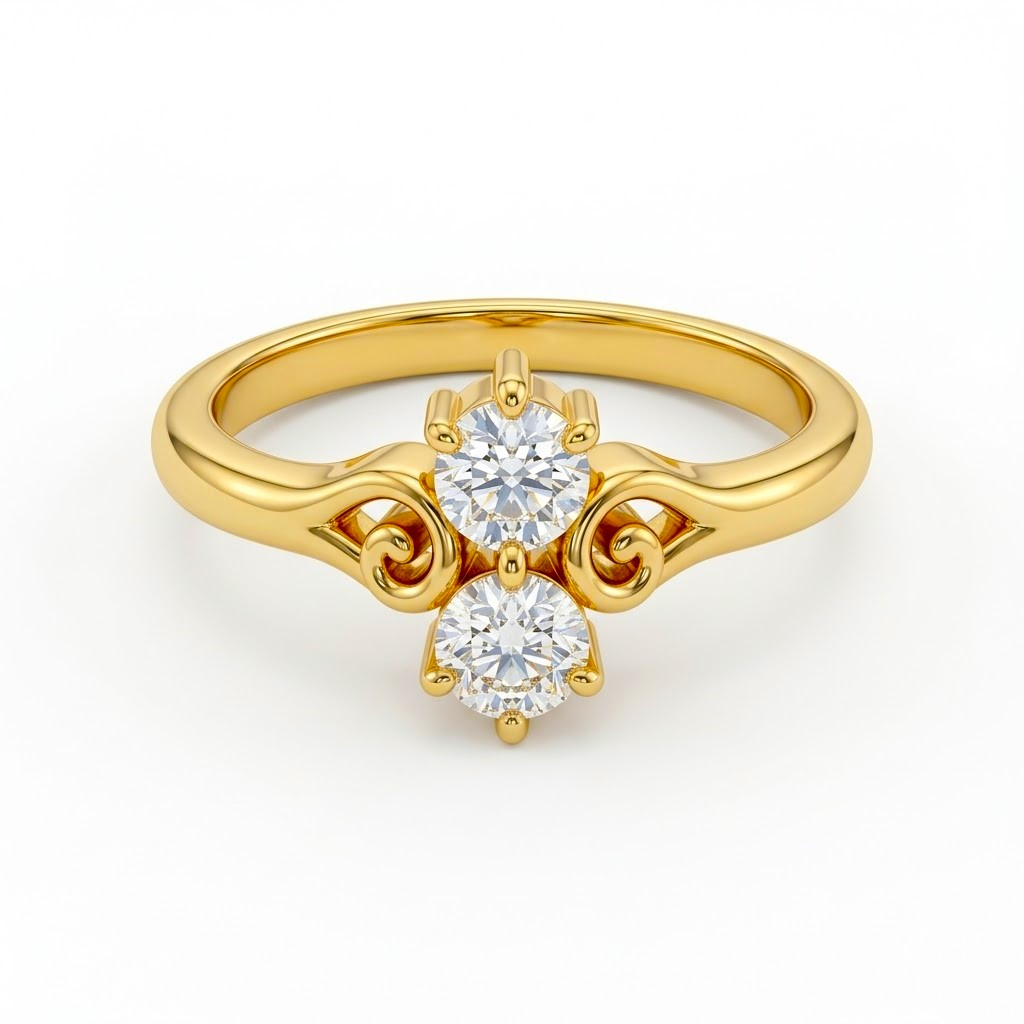 This elegant 22KT yellow gold ring showcases a beautifully handcrafted floral design, adorned with two sparkling brilliant-cut stones. The graceful bypass-style band and sleek polished finish add a touch of charm, making it ideal for daily wear or a meaningful gift for someone special.