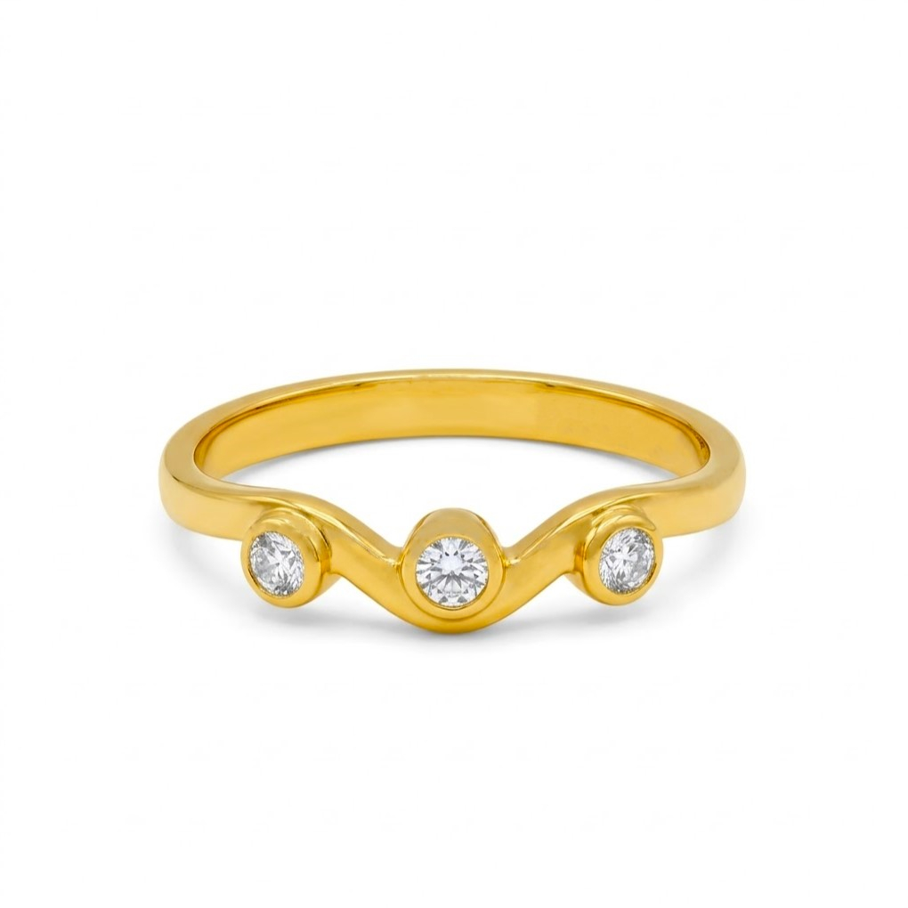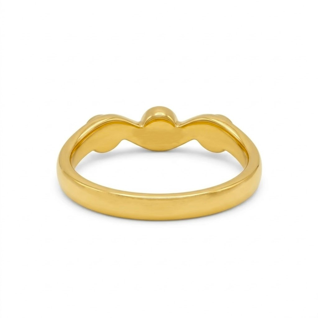 A trendy 22K gold ring featuring three sparkling stones set in a stylish zigzag pattern. The unique alignment adds a modern twist to classic elegance, creating a dynamic and eye-catching look. Perfect for those who love contemporary designs with a touch of sparkle