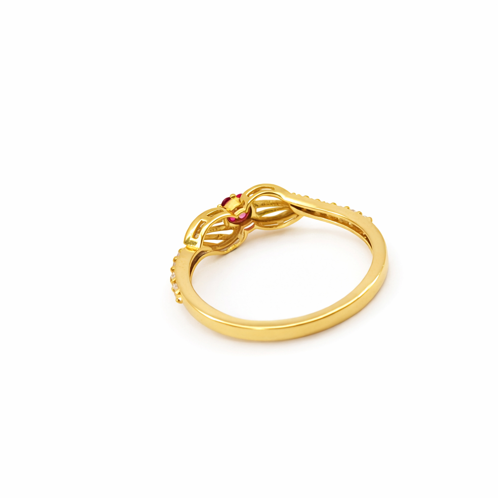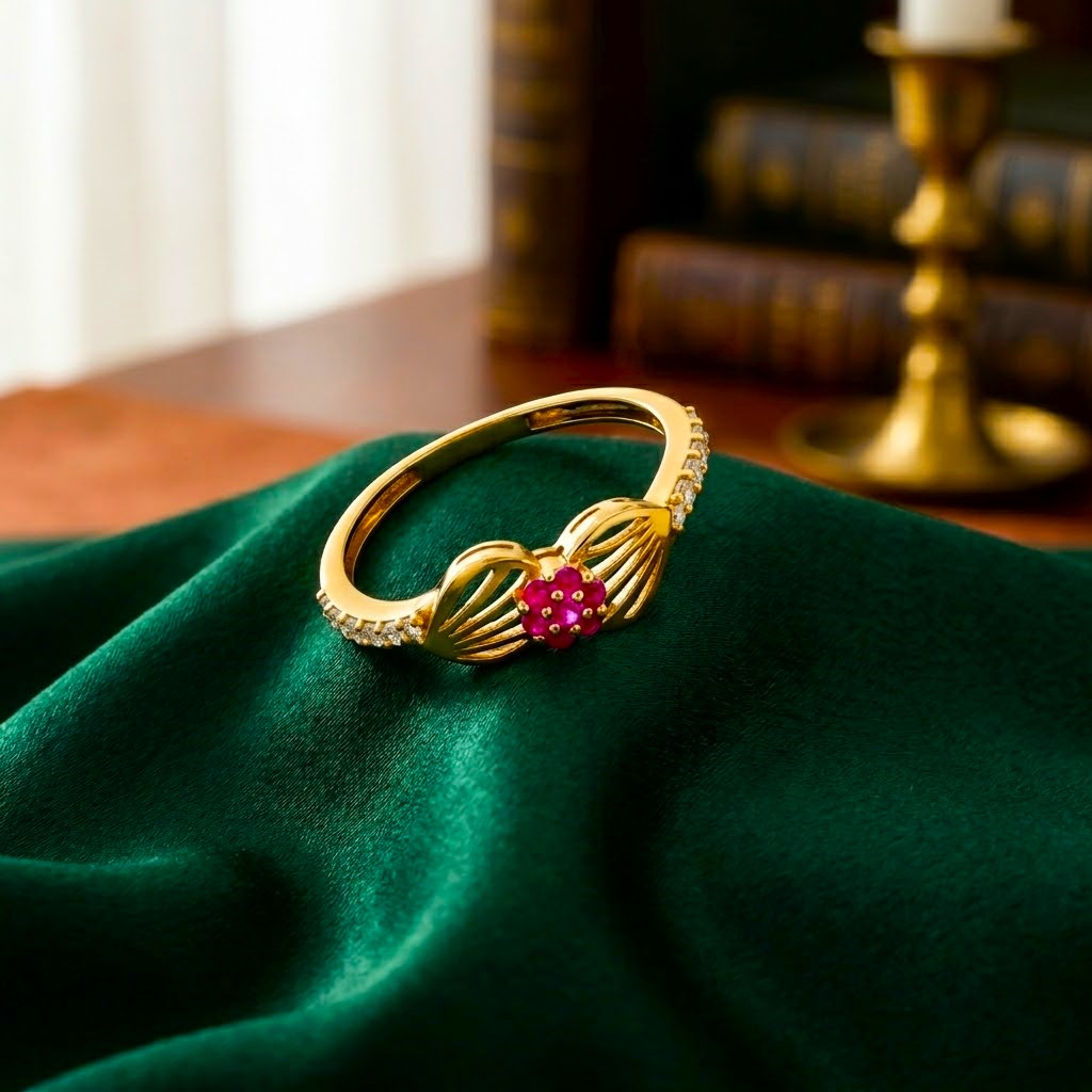 A graceful 22K gold ring featuring a delicate flower of pink stones at the center, beautifully complemented by leaf designs on both sides with fine vein detailing. A perfect blend of nature-inspired elegance and soft sparkle.