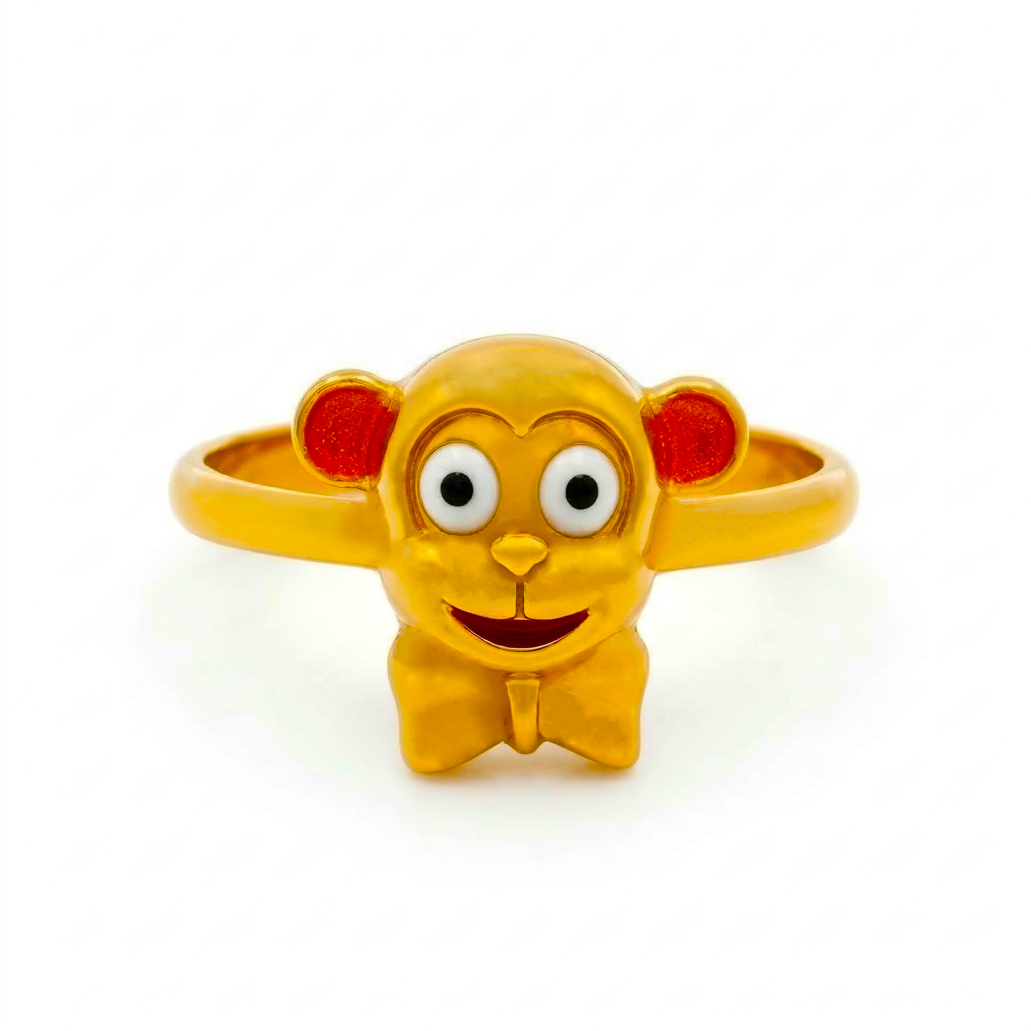 A playful 22kt yellow gold ring for kids, featuring a charming jungle buddy design. It is crafted with vibrant red and white enamel detailing to bring the character to life.