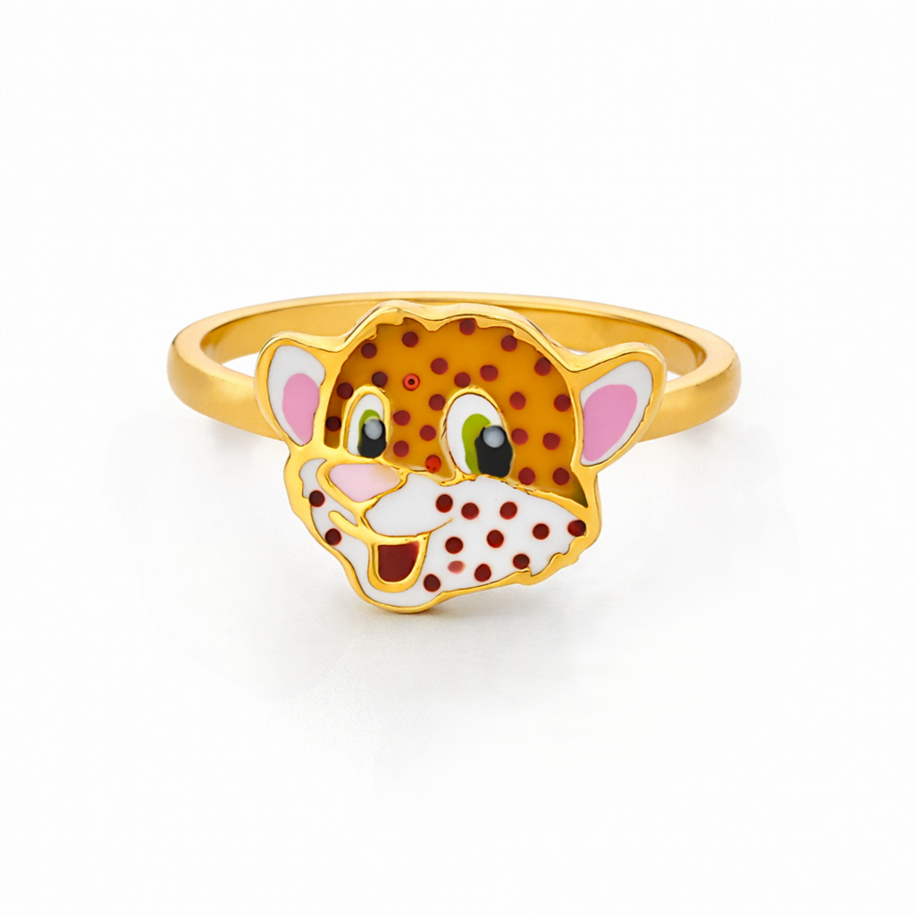 A playful gold-tone ring showcasing a vibrant, cartoon-style cheetah face. Its friendly expression and spotted details add a fun, spirited touch to any outfit.