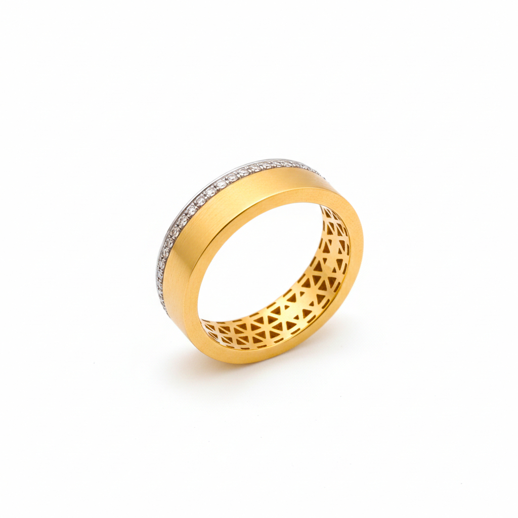This luminous gold band is accented with a sleek diamond line that catches the light effortlessly. Beneath, a beautifully patterned inner design offers subtle detail and airflow. Elegant, minimal, and enduring—made for everyday luxury.