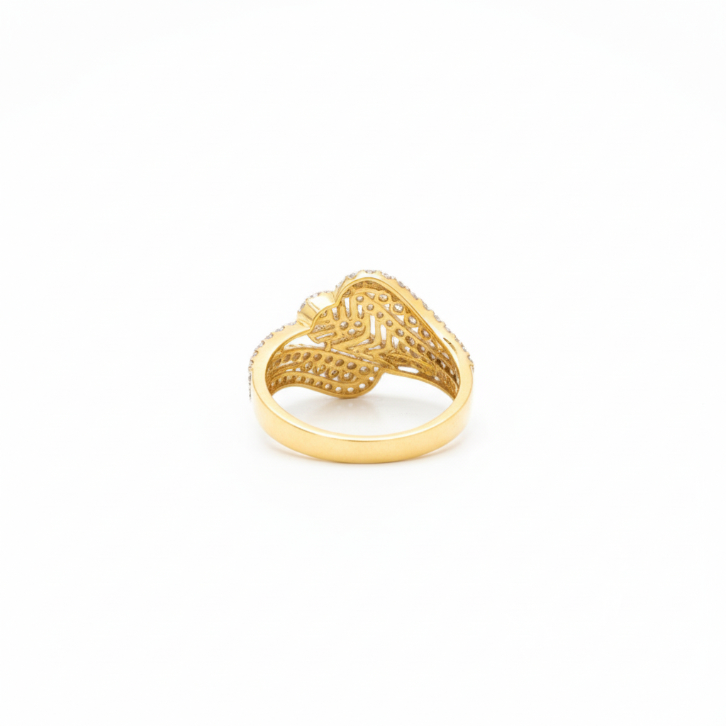 Crafted in 22K gold, this elegant CZ ring features a layered feather-inspired design with shimmering stones that add brilliance from every angle. A perfect blend of grace and glamour, ideal for festive occasions or everyday luxury styling.