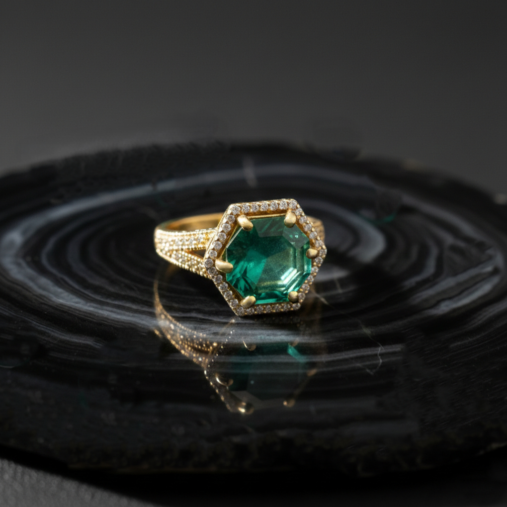 A graceful women’s ring crafted in a rich gold finish, featuring a deep green CZ stone set in a regal crown-style mount. Intricate detailing along the band adds a luxurious touch, making it perfect for festive occasions, celebrations, or elegant statement wear.