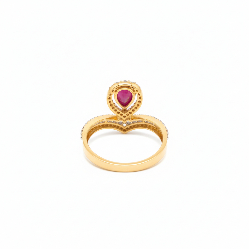 An elegant women’s ring crafted in a radiant gold finish, featuring a pink CZ stone embraced by a delicate halo design. The finely detailed band adds a graceful charm, making it perfect for festive occasions, celebrations, or everyday elegance.