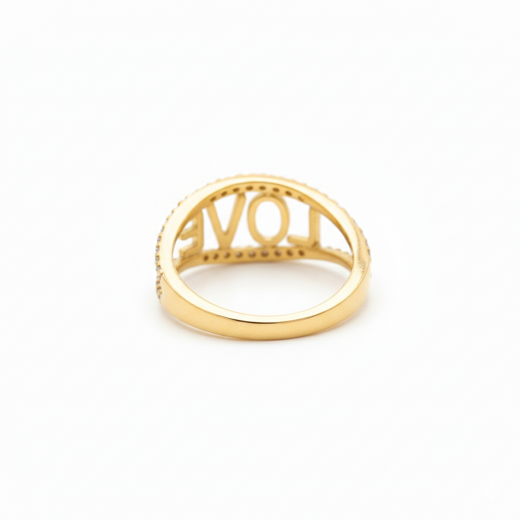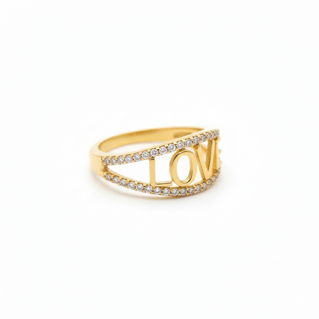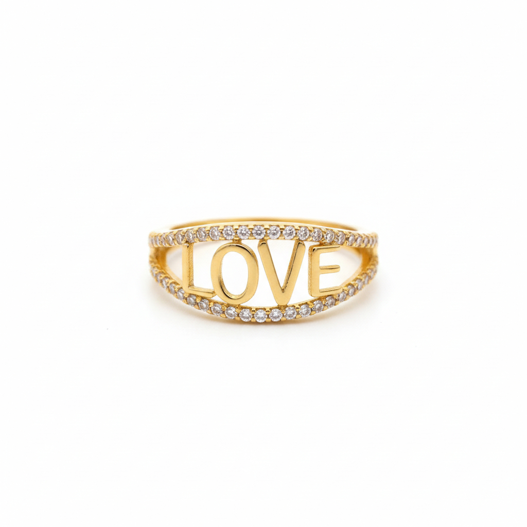 A beautiful gold ring featuring the word “LOVE” in a sleek open design, bordered with sparkling diamonds for added brilliance. Modern yet meaningful, this elegant band symbolises everlasting affection and makes a perfect gift for someone special or a stylish everyday statement