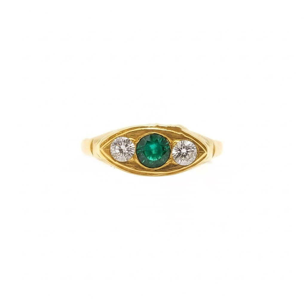 A graceful gold ring with a rich green centre stone, framed by two sparkling diamonds in a refined eye-shaped design. Representing harmony, protection, and classic elegance, this piece blends modern charm with timeless appeal. Perfect for daily wear or special occasions.