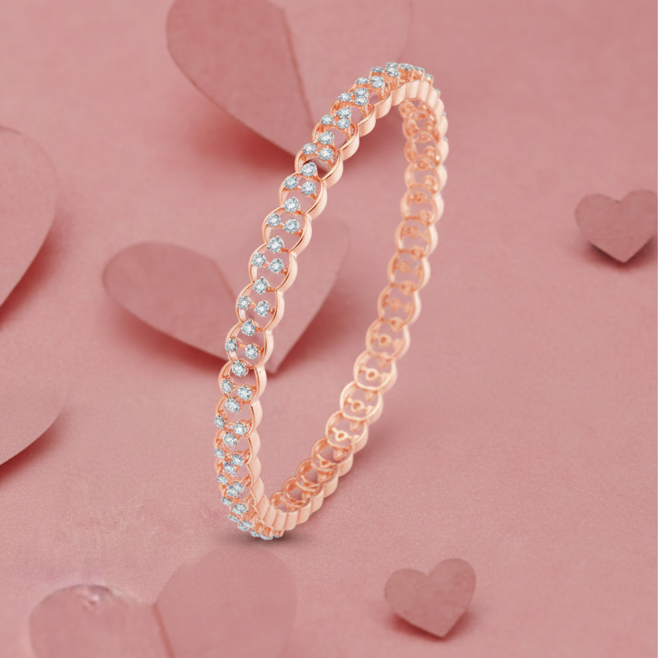 Grace your wrist with the charm of Celeste Bloom Diamond Bangle, a rose gold bangle with diamond-studded links. Its intricate curves sparkle with luxury, blending timeless elegance and modern flair—perfect for day or night.
