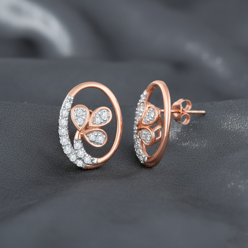 These charming stud earrings feature an enchanting oval frame crafted in polished rose gold, embracing a delicate clover motif adorned with shimmering pave-set diamonds. A blend of classic elegance and whimsical charm, perfect for adding a touch of sparkle to your everyday.