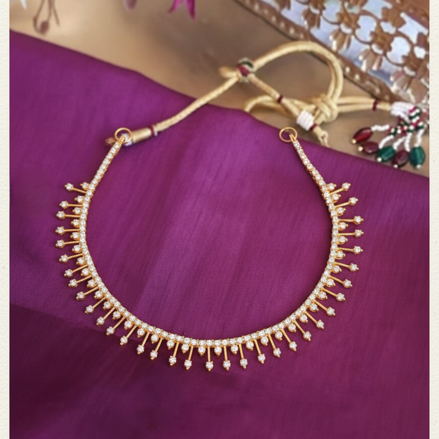 An elegant 22K gold necklace accentuated with sparkling cubic zirconia (CZ) drops arranged in a graceful, fringe-like pattern. Perfect for weddings, festive occasions, or evening wear. Lightweight yet striking, this necklace adds an effortlessly radiant charm to any attire.