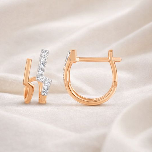These unique golden hoop earrings feature a bold lightning-inspired design, accented with shimmering diamonds for a radiant sparkle. Modern and edgy, they are perfect for those who love to make a statement while keeping elegance and style at the forefront.