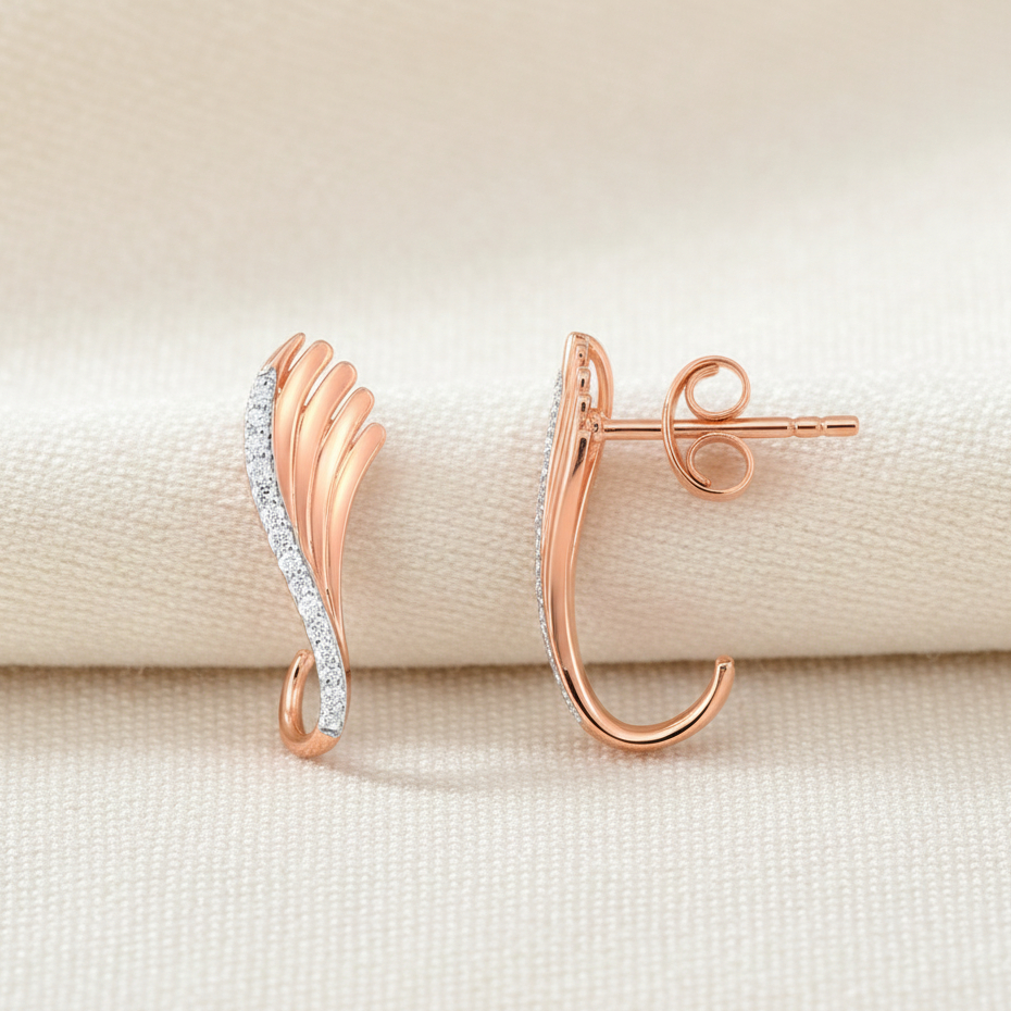 Inspired by graceful wings, these rose gold studs feature a flowing feather-like design highlighted with a sparkling diamond trail. The artistic curve adds movement and charm, making them a perfect blend of modern sophistication and timeless beauty for everyday elegance.