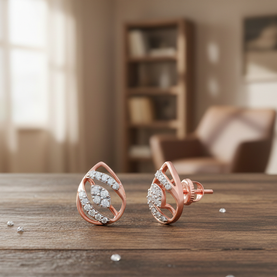 A pair of teardrop-shaped stud earrings crafted in a rose-gold finish. The design features elegant swirls embracing a cluster of shimmering diamonds at the center, giving it a modern yet graceful appeal. These earrings are perfect for both daily wear and special occasions.