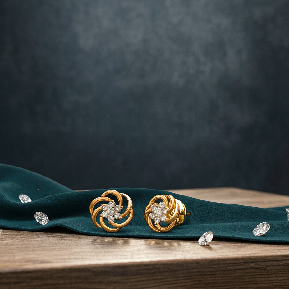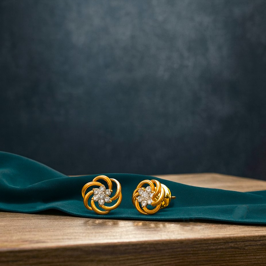 A graceful floral-inspired design featuring a cluster of sparkling diamonds at the center, encircled by elegant golden petal swirls. Crafted in polished yellow gold, these stud earrings embody timeless beauty and sophistication, perfect for everyday elegance or special occasions.