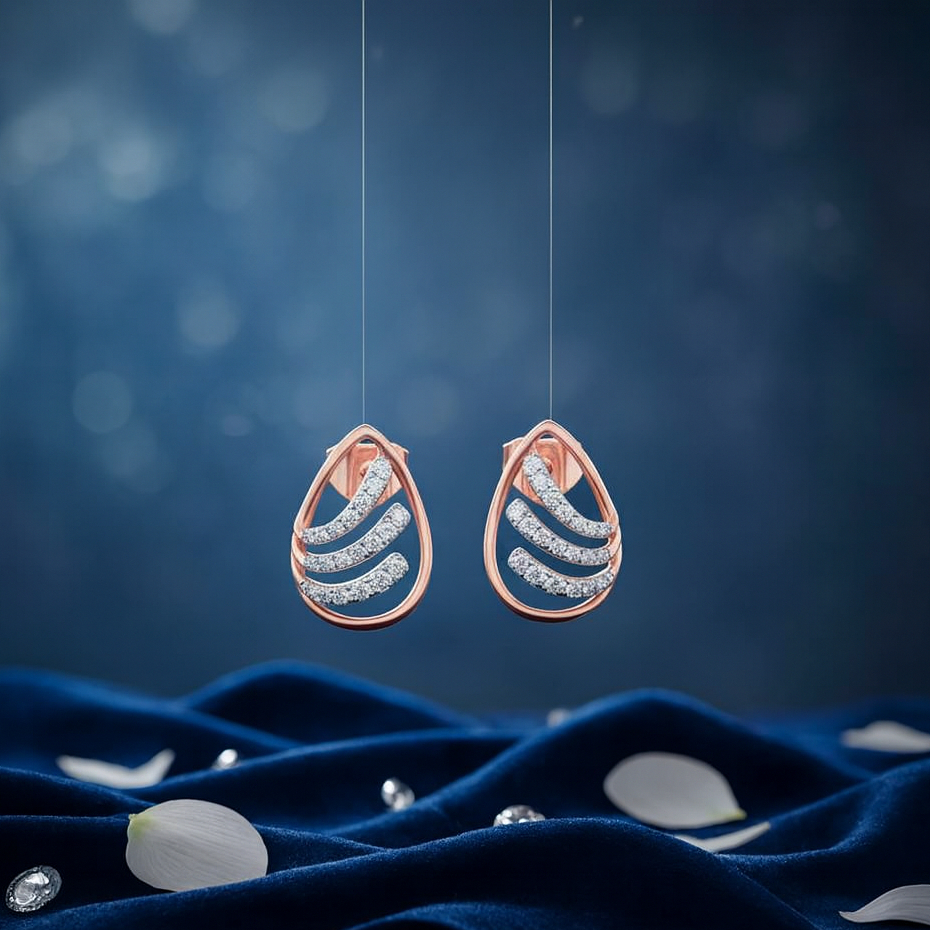 Elegant rose gold earrings featuring a captivating teardrop shape adorned with three sparkling lines of pave-set diamonds. Perfect for adding a touch of sophisticated brilliance to any ensemble, these earrings blend classic charm with modern allure.