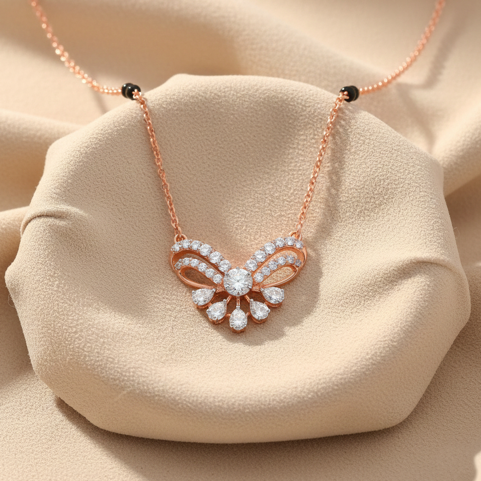 A graceful tanmaniya crafted in a butterfly-inspired design, symbolizing love and new beginnings. The wings are studded with sparkling diamonds, while teardrop-shaped gems dangle elegantly below, adding charm and radiance. Perfect for modern brides who love tradition with a touch of elegance.