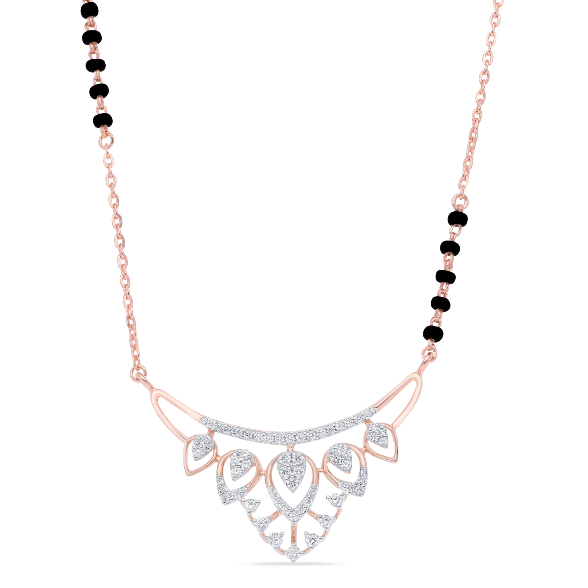 A graceful mangalsutra featuring a stunning pendant with layered petal-like motifs, each delicately outlined in gold and encrusted with shimmering diamonds. The intricate design forms a regal fan-shaped pattern, blending tradition with modern artistry. Perfect for women who love elegance.