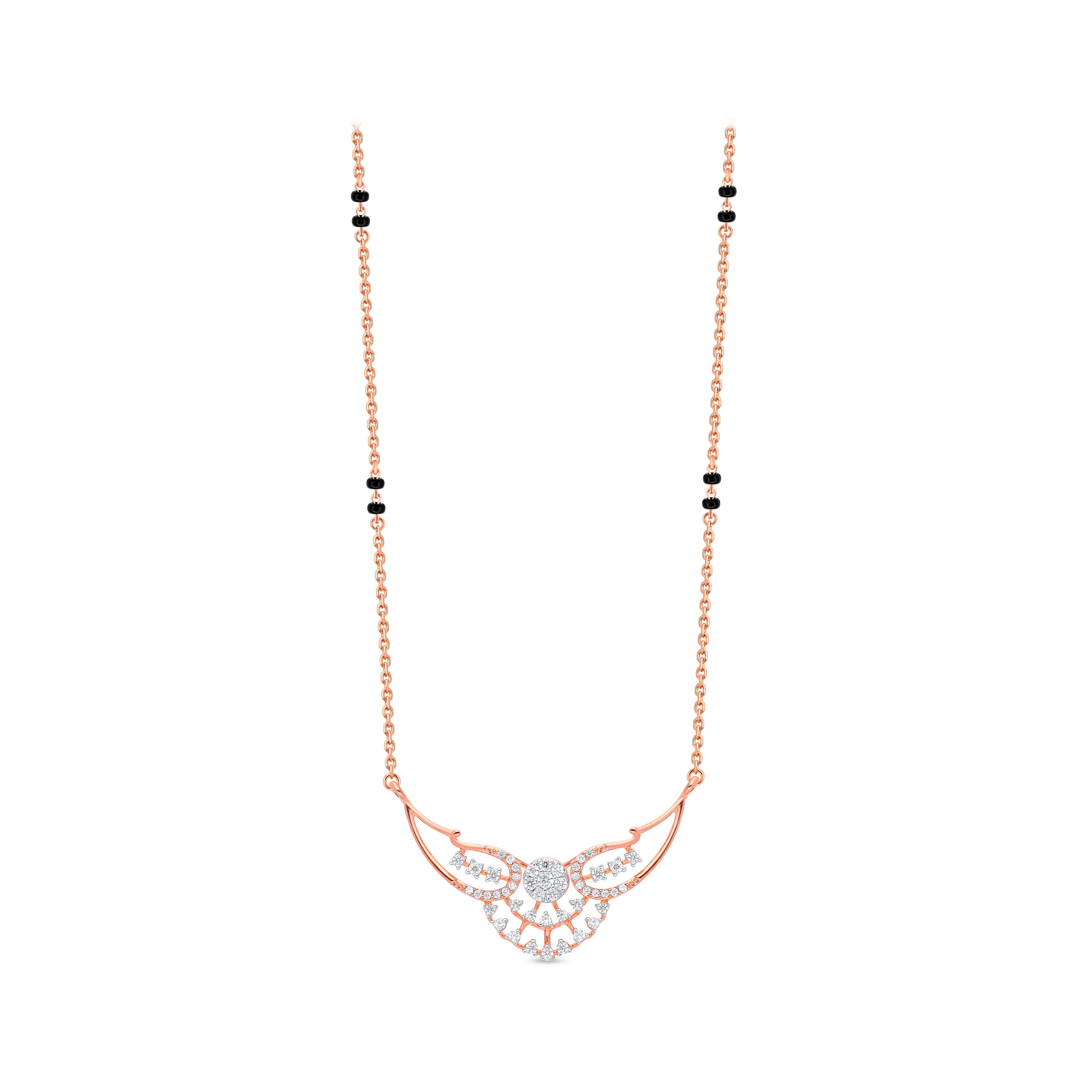 A delicate mangalsutra with a crescent-inspired pendant, beautifully layered with sparkling diamonds patterns that resemble soft moonlight. Its graceful curves and refined detailing make it a timeless piece, perfect for women who prefer subtle sophistication with a touch of modern charm.
