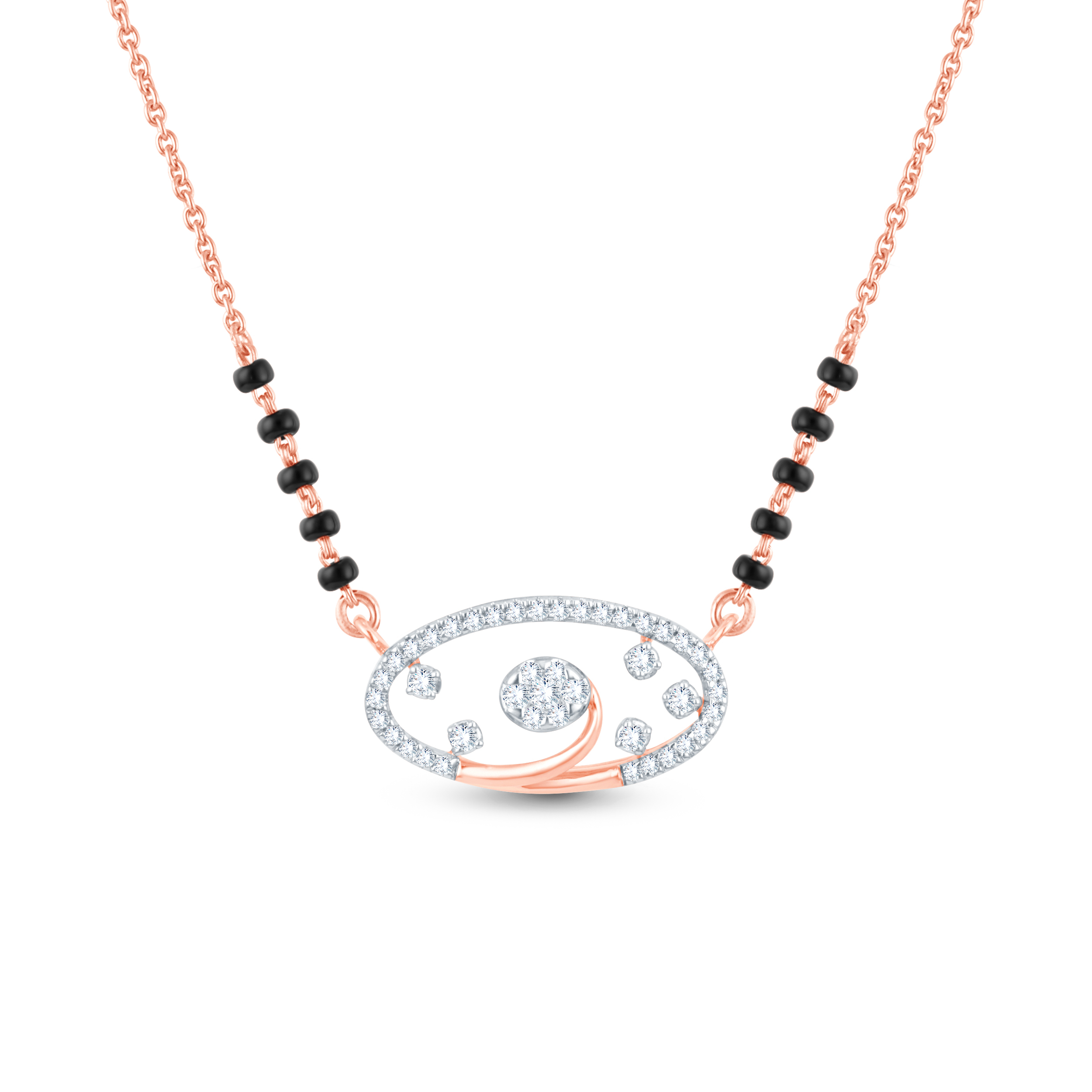 This exquisite mangalsutra blends tradition with modern elegance. Featuring a captivating oval pendant adorned with sparkling diamonds, it offers a contemporary twist on a timeless symbol of marital bliss and protection.