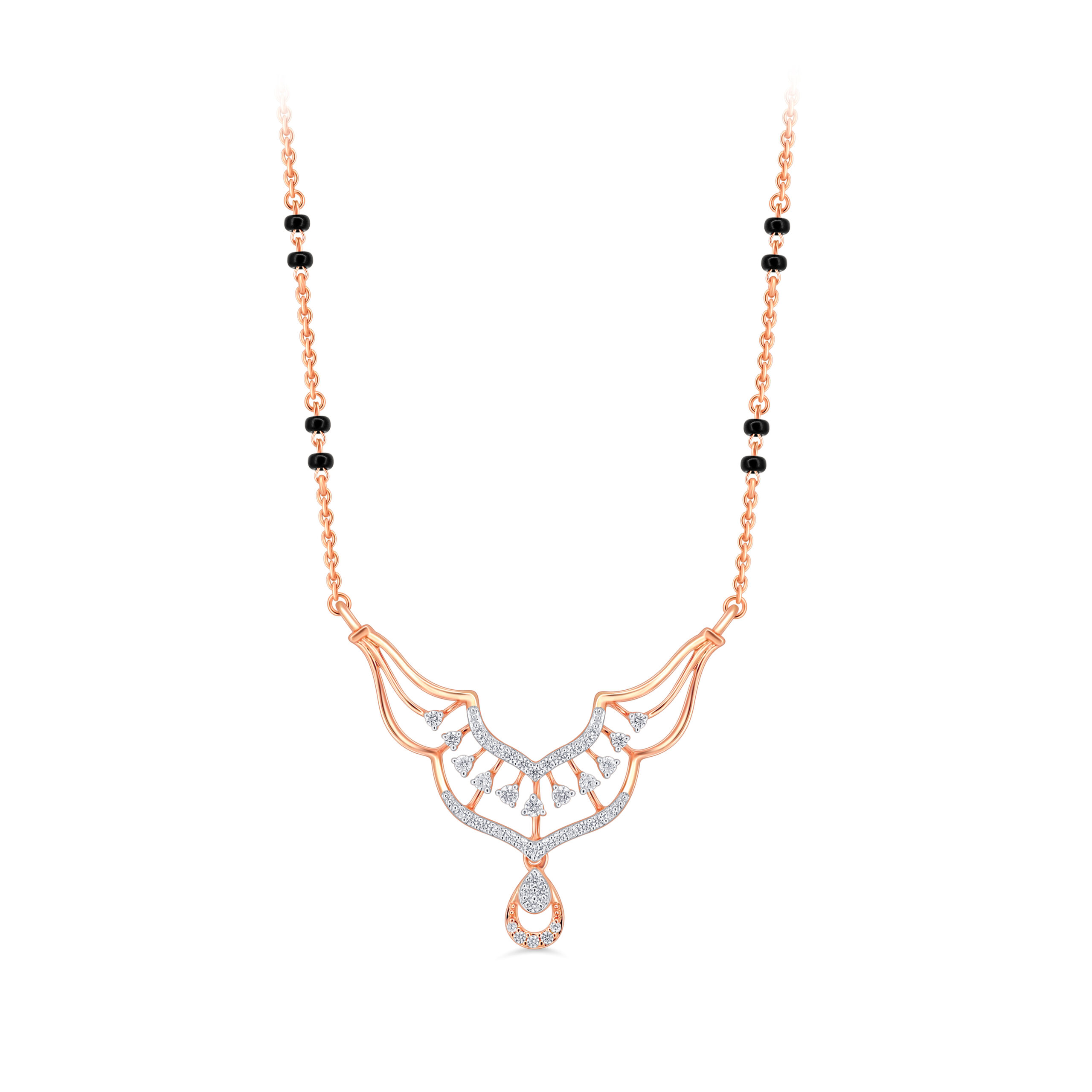 This exquisite gold mangalsutra features a delicate chain adorned with traditional black beads, culminating in a captivating diamond-studded pendant. Its elegant design blends tradition with contemporary sparkle, perfect for everyday grace or special occasions.