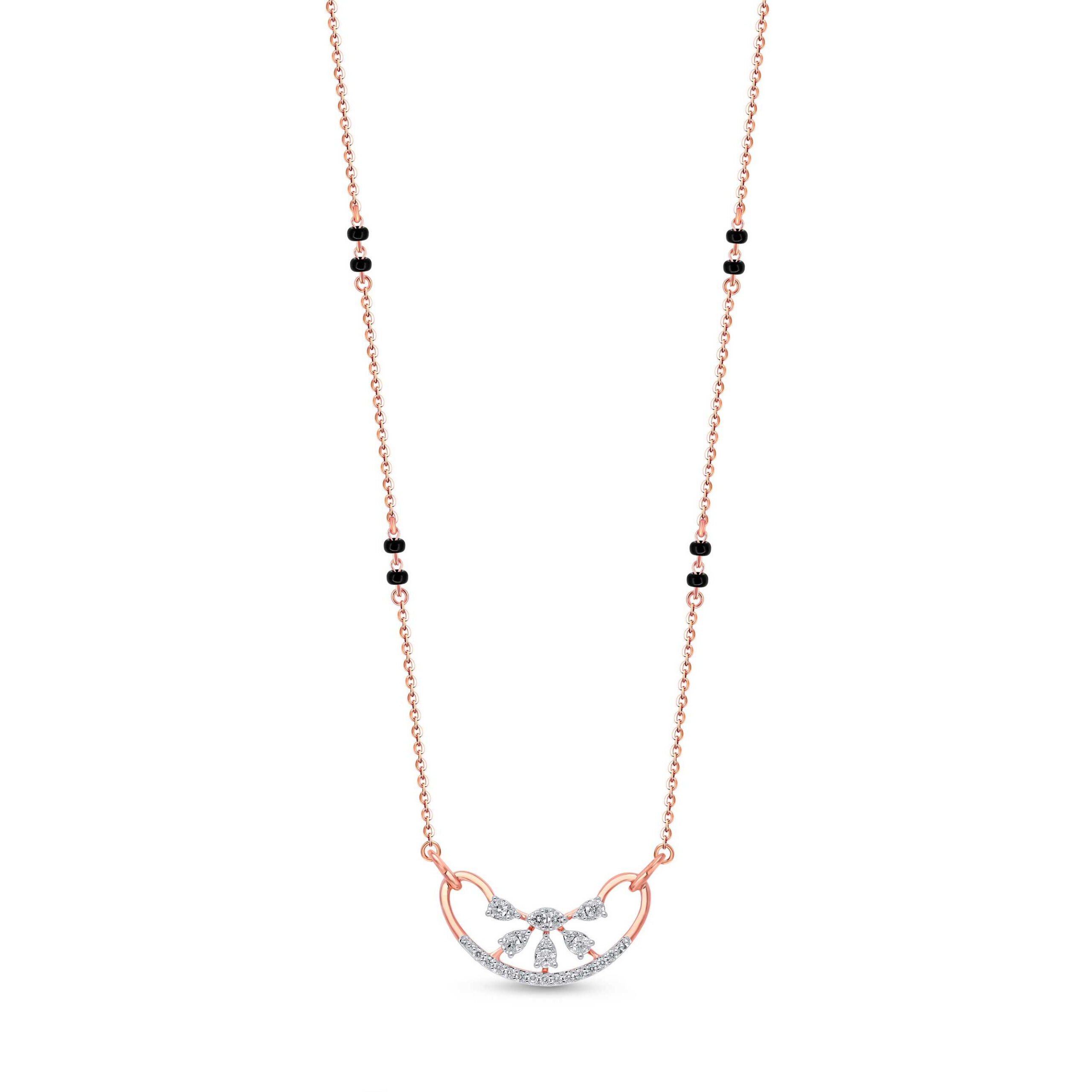 Exquisite rose gold mangalsutra with traditional black beads, symbolizing marital bliss and protection. Features a stunning diamond-studded heart pendant, blending heritage with modern elegance for the contemporary bride. Perfect for celebrating everlasting love.