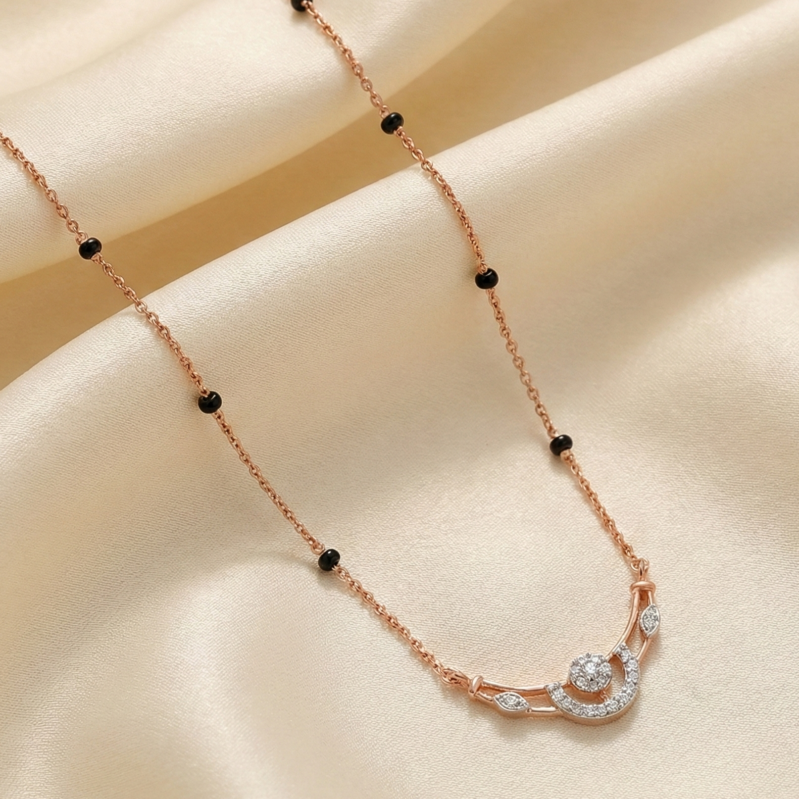 A delicate gold-tone chain mangalsutra featuring interspersed black beads and a captivating central diamond pendant. The pendant showcases an intricate design with serene azure accents and a prominent circular center piece, exuding timeless grace and sophistication.