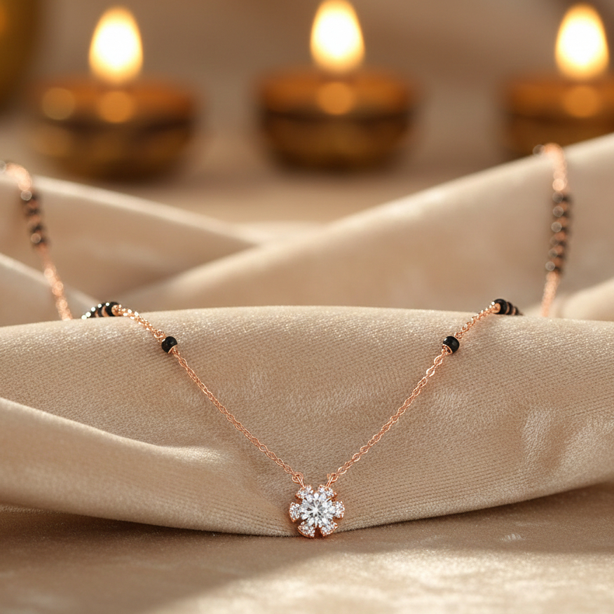 A delicate tanmaniya featuring a slender chain with spaced black beads on both sides, leading to a radiant floral-shaped diamond pendant at the center. Its minimal yet elegant design beautifully blends tradition with a touch of modern sophistication, making it perfect for everyday wear.